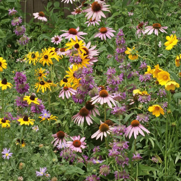 While the mix varieties may vary, some of the most common varieties are Black-Eyed Susan (Rudbeckia hirta), Purple Coneflower (Echinacea purpurea), Lance-Leaved Coreopsis (Coreopsis lanceolata), Plains Coreopsis (Coreopsis tinctoria), Wild Bergamot (Monarda fistulosa), New England Aster (Symphyotrichum novae-angliae), Partridge Pea (Chamaecrista fasciculata), Butterfly Milkweed (Asclepias tuberosa), Wild Lupine (Lupinus perennis), Wild Columbine (Aquilegia canadensis), Wild Indigo (Baptisia australis), Wild Geranium (Geranium maculatum), Wild Ginger (Asarum canadense), Wild Strawberry (Fragaria virginiana), Wild Violet (Viola sororia), Sweet Black-Eyed Susan (Rudbeckia subtomentosa), White Prairie Clover (Dalea candida), and Wild Bergamot (Monarda fistulosa).